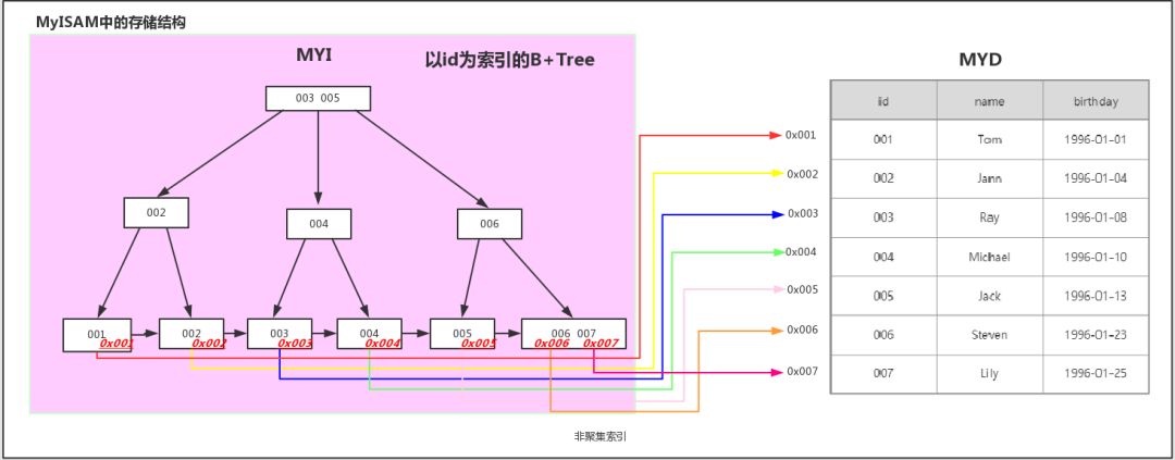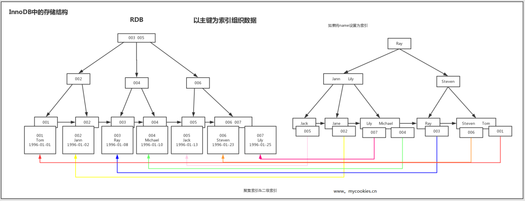 普通索引:即一个索引只包含单个列,一个表可以有多个单列索引 唯一索引:索引列的值必须唯一,但允许有空值 复合索引:即一个索引包含多个列 聚簇索引(聚集索引):并不是一种单独的索引类型,而是一种数据存储方式。具体细节取决于不同的实现,InnoDB的聚簇索引其实就是在同一个结构中保存了B-Tree索引(技术上来说是B+Tree)和数据行。 非聚簇索引:不是聚簇索引,就是非聚簇索引(认真脸)。