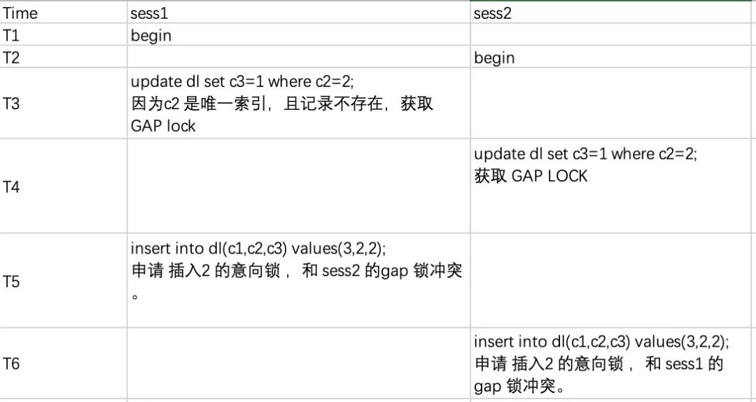 sess2 在 T6 时刻执行了插入,由于插入的时候需要申请插入意向锁(insert intention lock),同样需要等待 Sess1 在 T3 持有的 GAP 锁,两个会话循环等待对方释放锁,因此导致死锁。