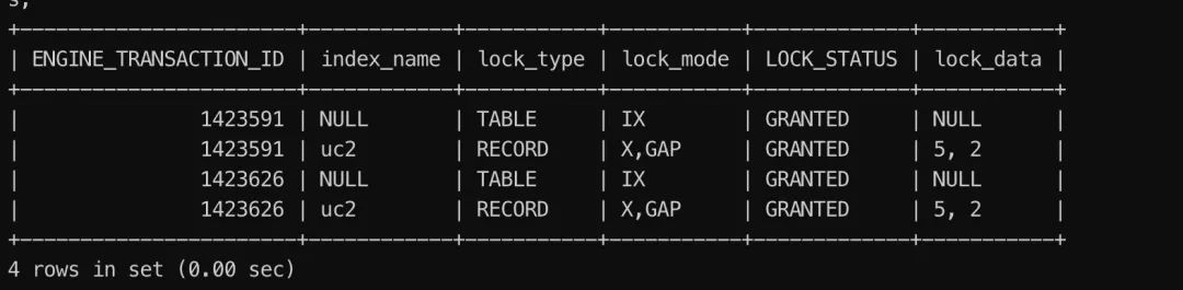 sess2 在 T4 时刻执行了更新,affect rows 为 0 ,同样在在c2的(0,3)区间中加了GAP锁 lock_mode X locks gap before rec ,GAP 锁和 GAP 锁相互兼容,因此 sess1 和 sess2 不会发生等待。