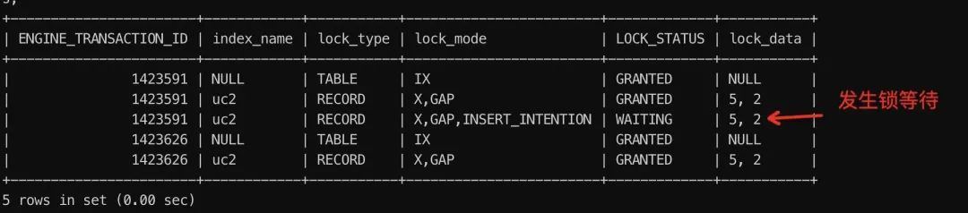 sess1 在 T5 时刻执行了插入,由于插入记录 c2 =2 的时候需要申请插入意向锁(insert intention lock) ,而 insert intention lock 锁和已存在的 (0,3) 的