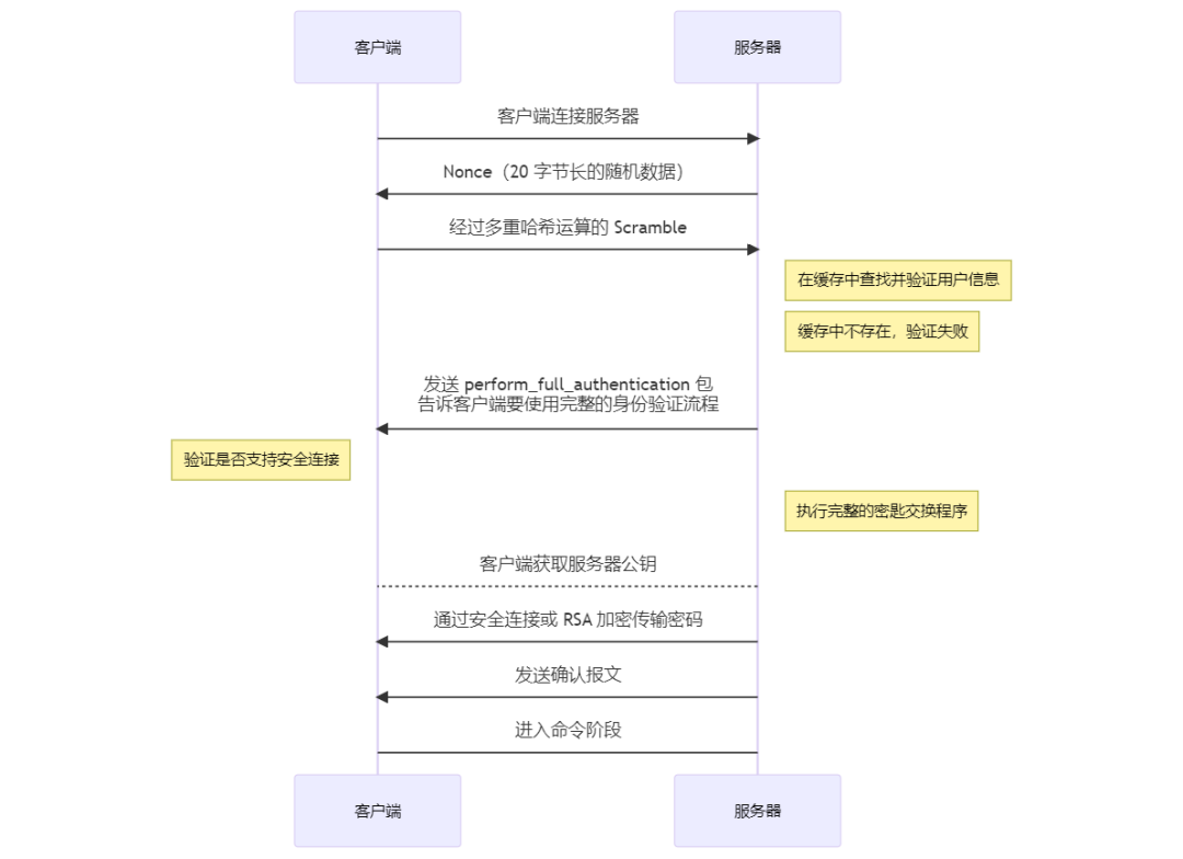 从图中我们看到,客户端对密码进行多重哈希加密生成 Scramble 发送给服务端, 服务端检查内存的缓存(memory cache)中是否存在该条目。当值在缓存中存在证明本次连接合法,服务器会告诉客户端快速认证成功:发送 fast_auth_success 包到客户端,并且发送确认报文。然后服务器就可以和客户端正常通信了。