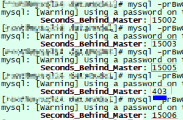 手动执行 show slave status\G 命令查看 Seconds_Behind_Master 延时值,结果如下: