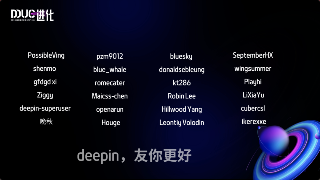 一年来,他们中有人为 deepin 生态贡献了杰出的应用;有人积极维护论坛环境,为大家努力营造积极的、有序的沟通氛围;有人积极提供各类问题、解决方案和软件包;有人为 deepin 社区提供的优质资源整理资料与技术分享,还有人积极参与 deepin wiki 的维护,编写新词条……