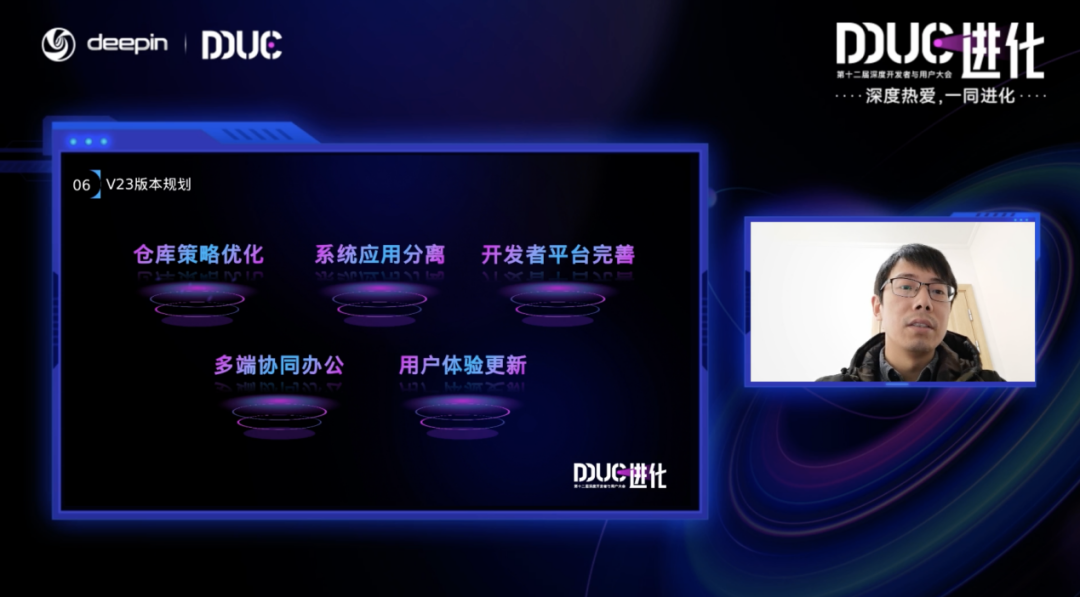 据王耀华介绍,备受关注与期待的deepinV23版本将在仓库策略优化、系统应用分离、开发者平台完善、多端协同办公、用户体验更新上做进一步的优化。