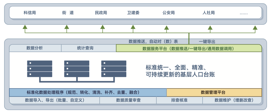 为助力基层政府精准管理统筹和精细化数据治理,智慧社区“数据通”能够提供基层数据精细化治理完整解决方案。智慧社区“数据通”首先解决了基层复杂的数据类别,帮助社区或街乡(镇)一级政府快速建立标准统一、全面、精细、可持续更新的智慧化基层数据管理平台,通过“统一采集、统一制表、统一报送、统一管理”的基层数据管理新机制,支撑社区和街乡及上级各部门专项智慧化应用需求。
