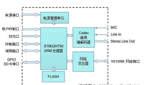 SIP2101V/SIP2103V使用了速度高达400MHz的ARM处理器构架加专业的双向音频Codec编解码器, ARM处理器负责数据的传输,用户命令的解析执行以及功放接口的控制,专业音频Codec负责音频的输入及输出。