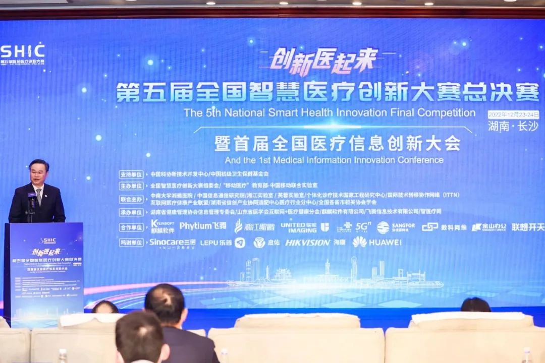 本次大赛由中国科协新技术开发中心、中国初级卫生保健基金会支持,移动医疗教育部中国移动联合实验室(以下简称“联合实验室”)发起,全国智慧医疗创新大赛组委会主办,中南大学湘雅医院、中国信息通信研究院、湘江实验室、芙蓉实验室、湖南省信创产业协同适配中心医疗行业分中心、全国各省市相关协会学会联合主办,麒麟软件有限公司、湖南省健康管理协会信息管理专委会、山东省医学会互联网+医疗健康分会、飞腾信息技术有限公司联合承办。麒麟软件高级副总裁宋介鹏作为承办单位代表感谢了现场与线上的专家评委和参赛团队,并与其他单位代表共同宣布全国总决赛医院业务应用创新方向、技术创新方向、基层卫生专题赛、信创专题赛二等奖获奖项目名单。