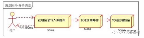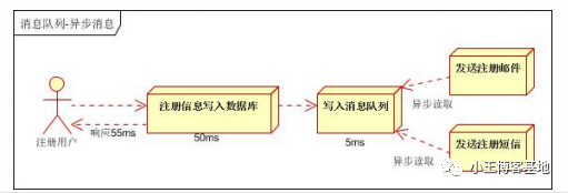 我们可以在将注册信息保存数据库之后,把要发送注册邮件和发送短信的消息写入消息队列,然后就告知用户注册成功。发送邮件和短信将由订阅了消息的应用异步的去执行。这样耗时的问题就解决了!!