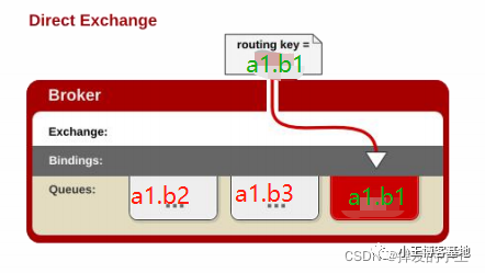 消息中的路由键(routing key)如果和Binding 中的 binding key 一致, 交换器就将消息发到对应的队列中。路由键与队列名完全匹配,如果一个队列绑定到交换机要求路由键为"a1.b1",则只转发 routing key 标记为"a1.b1"的消息,不会转发"a1.b2”,也不会转发"a1.b3" 等等。它是完全匹配、单播的模式