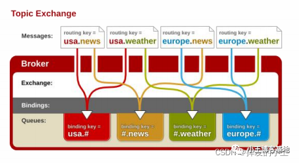 topic是升级版的fanout模式,做了选择权,并不是全都会接受,符合条件才会收到!topic 交换器通过模式匹配分配消息的路由键属性,将路由键和某个模式进行匹配,此时队列需要绑定到一个模式上。它将路由键和绑定键的字符串切分成单词,这些单词之间用点隔开。