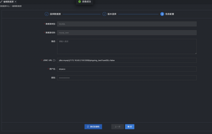数据源中心添加数据源时需要进行数据源连通性检测,确保数据源是真正可用的,具体就是通过调用 DataSourceX 模块来实现。连通性检测通过之后,可以进行数据源的保存,并在任务中进行引用。