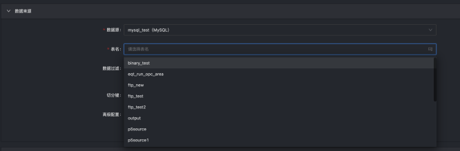 数据同步任务源表结果表配置中的表、字段等信息都是通过 DataSourceX 模块进行获取。