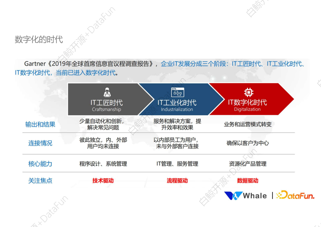 - IT 数字化时代,这个时代强调“探索”,关注企业商业模式的变化,强调敏捷的开发方案,所有行为都是以数据为驱动的。