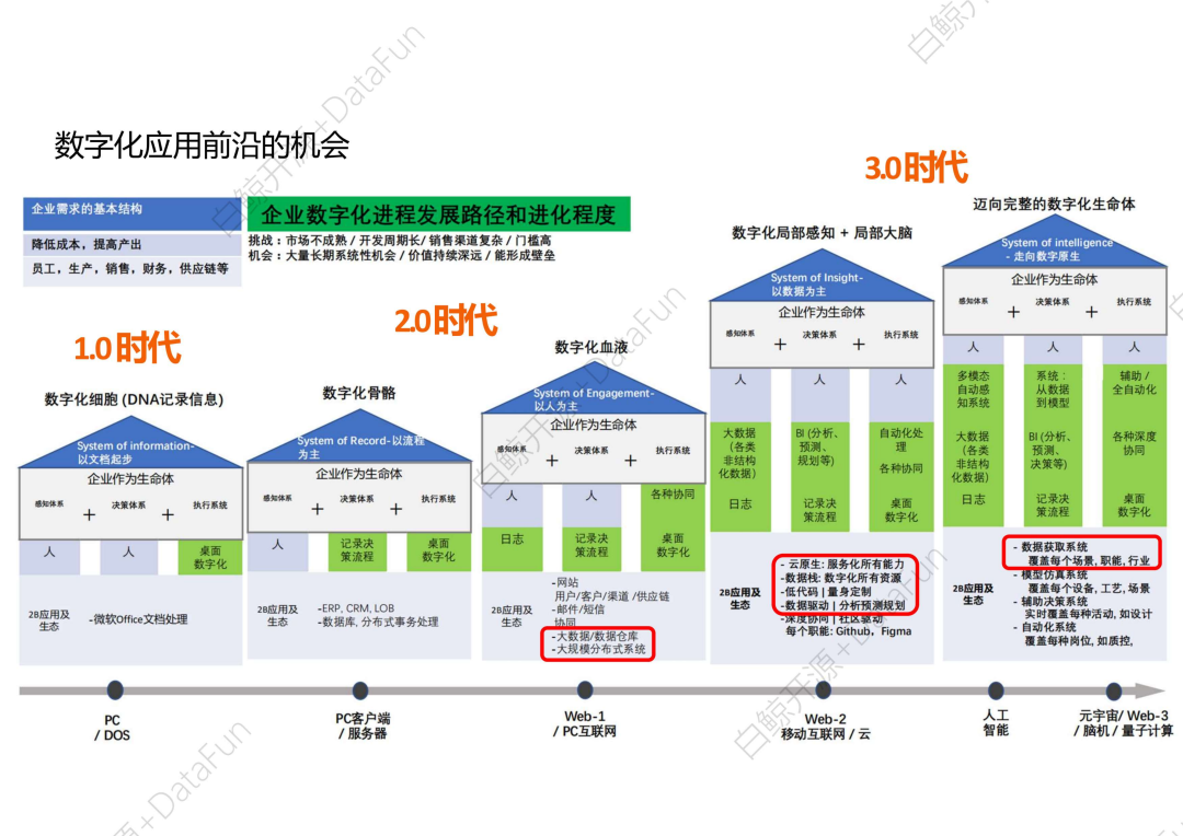 - 数字 3.0 时代:2010 年以后,尤其是从 AWS 在 2013 年发布云计算开始,数字化已经成为推动世界进步发展的核心引擎。通过数据,为企业和个人提供了全面的外界感知能力,以及分析及预测的能力,从而大幅度地提升了各行各业进行业务创新,精益生产及市场营销效益。并且未来会通过人工智能,元宇宙,脑机交互,量子计算等将整个世界带入一个数字化的时代。