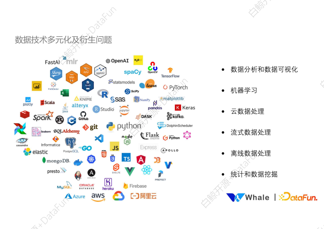 为了处理更大的数据量和不同的数据类型,以及应对数据分析更快更智能的要求,最近十几年来,数据处理和应用的技术的发展突飞猛进。从中心化的数据仓库衍生到复杂的数据技术体系,细分为了多种的数据处理领域,比如机器学习、云数据处理、流式数据处理、离线数据处理、数据统计与数据挖掘。如图所示,图中各种 Logo 所代表的技术的出现大多数都是在近 10 年内,并且几乎每个月都有新的技术和产品出现,几乎每两年都可以看到技术栈发生一个大的变革,而且由于开源模式的出现,并且各国的数据主权以及技术独立意识的增强,业界已经很难出现过去二三十年那种统一标准化的时代,从而增加了数据从业者的从业门槛和学习复杂度。
