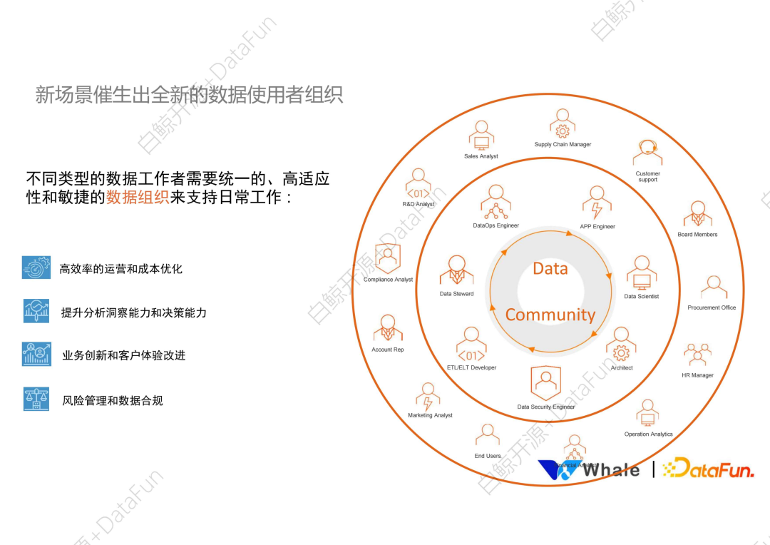 除了数据爆炸,企业对数据部门的诉求在最近的一段时间也产生了很大变化,从更好地管理数据资产转变到更快地产生业务价值。获得精益化的数据并且快速验证产生和转化出业务价值已经成了企业每个部门的头等大事。数据的使用者也从数据专家(下图中内圈的角色),转化成为新的数据工作者(下图中外圈的角色),包括各个生产线的学科专家,各个业务线的运营人员,以及企业管理者,甚至最终用户, 这些非技术人员。在这种背景下,需要一个新的数据使用者组织来去支撑整个的数据应用的流程以及数据应用的方式。这个新的组织Data Community 就出现了,其使命就是持续支持数据产生价值,加速业务栈去实现,以及优化生产周期和支撑企业的精益化运营。