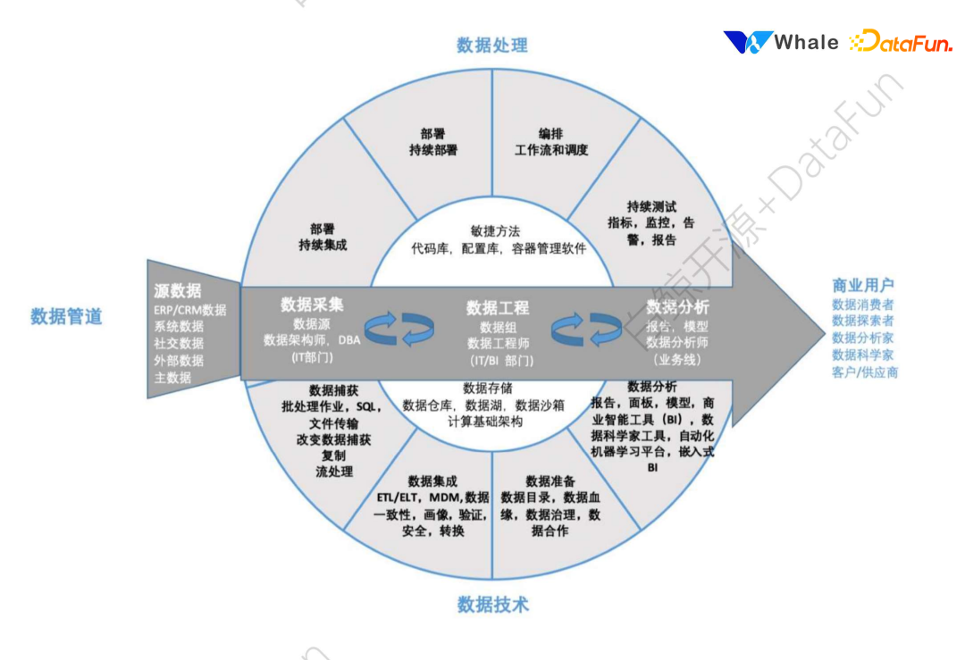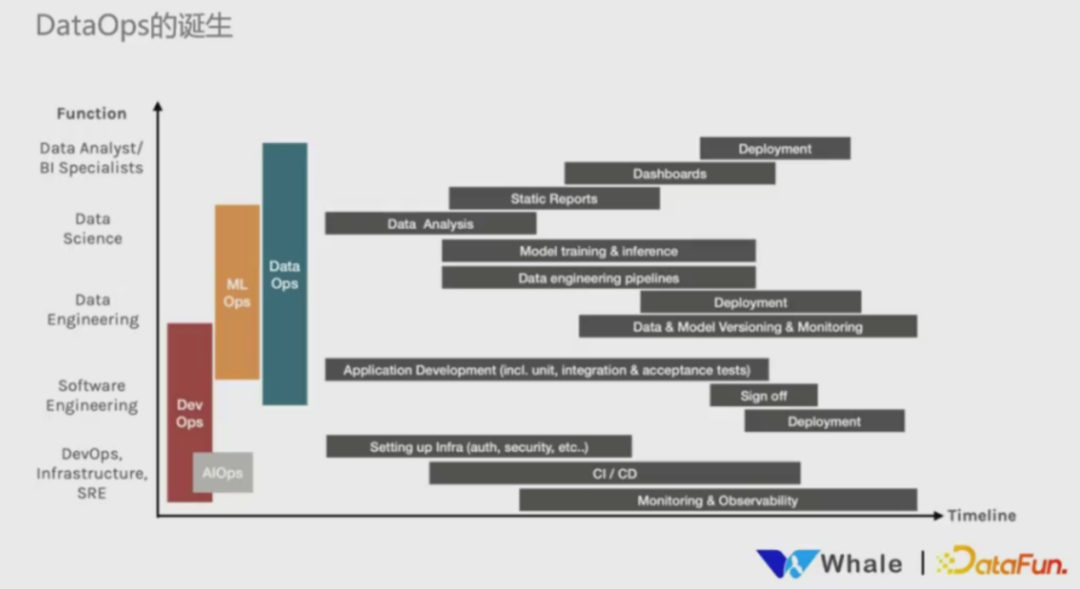 这样就涉及到了运维、开发、数据处理、分析这四个团队, 由于数据使用的模式很混乱且复杂,团队之间往往会产生大量的摩擦。在这种情况下,各种以数据为中心的使用团体会站在一起,而各种以数据为中心的 Ops 也会应运而生。比如 DataOps、MLOps、AIOps,其中 DataOps 覆盖了软件开发、数据工程、数据科学处理和数据分析这四个主要的 IT 能力,并且贯穿了数据的整个生命周期,是既 DevOps 之后,最重要的 Ops 能力: