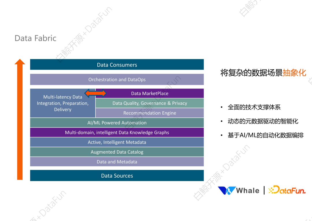 历史最悠久的一类数据架构叫 Data Fabric,它是把数据管理系统和应用程序编织在一起,这种服务会涵盖整个数据集成、访问、转换、建模、可视化、治理和交付。为了在这些所有不同的服务之间提供连接,Data Fabric 提供了包含链接到各种数据生态系统工具的连接器,把很多各种复杂的功能连接到一起,使用抽象的方式,将碎片化的数据视图统一,利用增强数据目录激活元数据,通过数据市场和数据编排等功能,为消费者提供数据并推动更广泛的数据服务。Data Fabric 特点是将复杂的数据场景抽象化,统一了跨环境的数据管理,依靠主动元数据为数据集成、分析提出建议和智能决策。