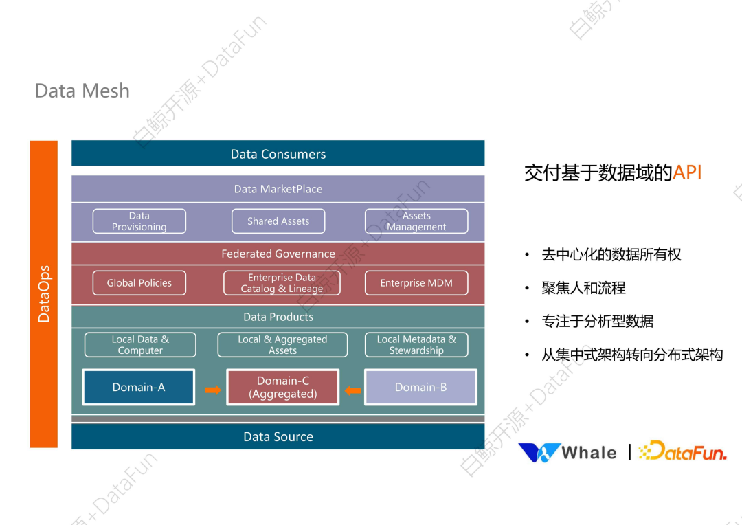 第二类是在 2017 年左右提出的一个概念叫 Data Mesh。Data Meh 的提出是因为看到随着数据源和数据消费者数量增加,需要连接的 Data Pipeline 也在增加,这导致了下游的数据消费者在使用时,需要很长的时间来等待复杂的数据管道的建立,才能够去得到他们所需要的数据, 而平台的构建和运维的复杂程度也越来越大。所以形成了 Data MarketPlace 的概念, 通过交付基于数据域的 API,来服务整体的数据客户。DataMesh就是通过聚焦数据使用中的人和流程来构建不同的产品并把它上架到DataMarketPlace里。其中使用了联合治理的模式,如从数据域A和数据域B集成了所有相关连的数据后形成一个黄金的数据组合数据域C,然后把这些黄金数据提交给 Data MarketPlace,对外使用数据 API 提供民主化数据服务,确保数据所有权不会成为数据流通、整合、消费的壁垒,并使用分布式架构保证系统能力的平滑扩展。