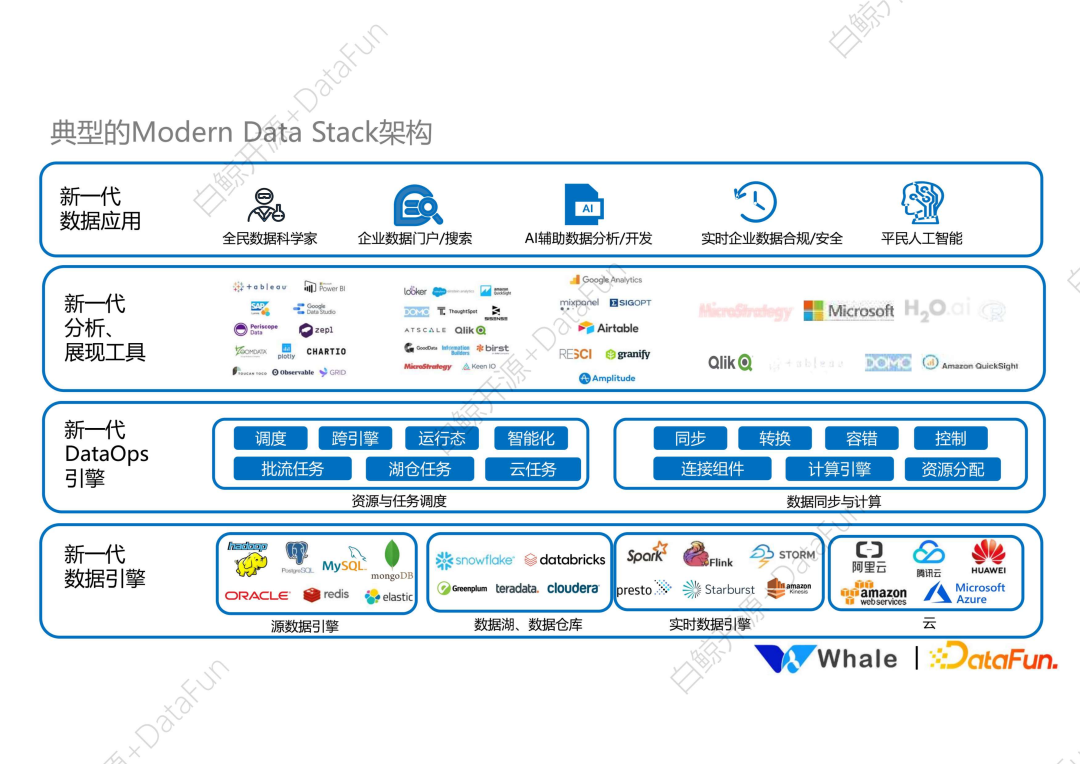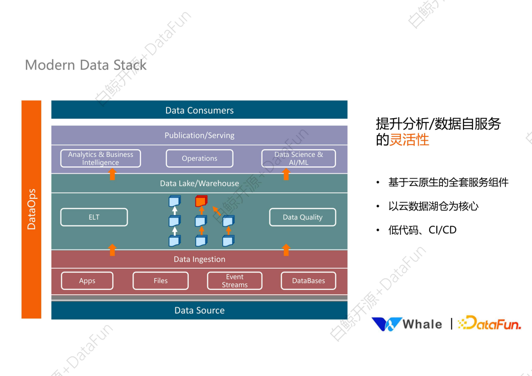它们组成了 Modern Data Stack 一个完整体系架构,同时它是一个以DataOps 为核心且关注灵活自服务的技术体系。