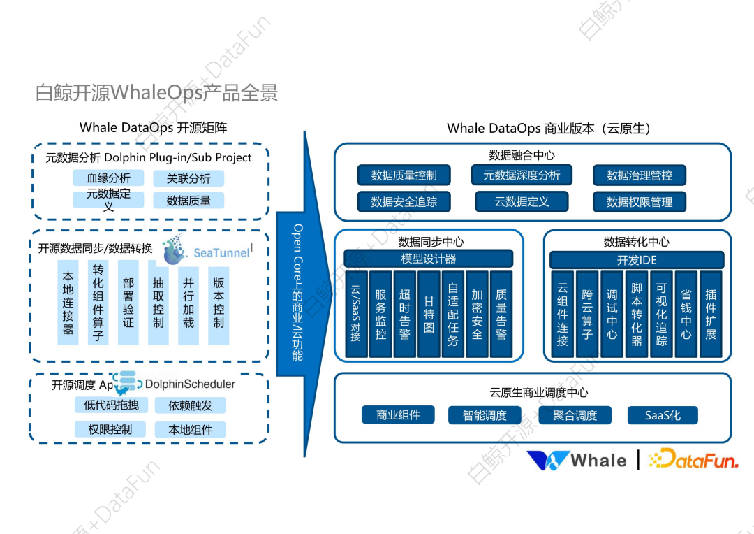 整个白鲸开源的 WhaleOps 商业产品就是一个典型的 Modern Data Stack 的技术栈,将 MBS 中的核心的全栈调度能力整合到一起形成一整套的云原生的商业套件,涵盖数据的智能调度、数据同步、数据转换、数据质量和元数据以及数据治理这六大类的功能。
