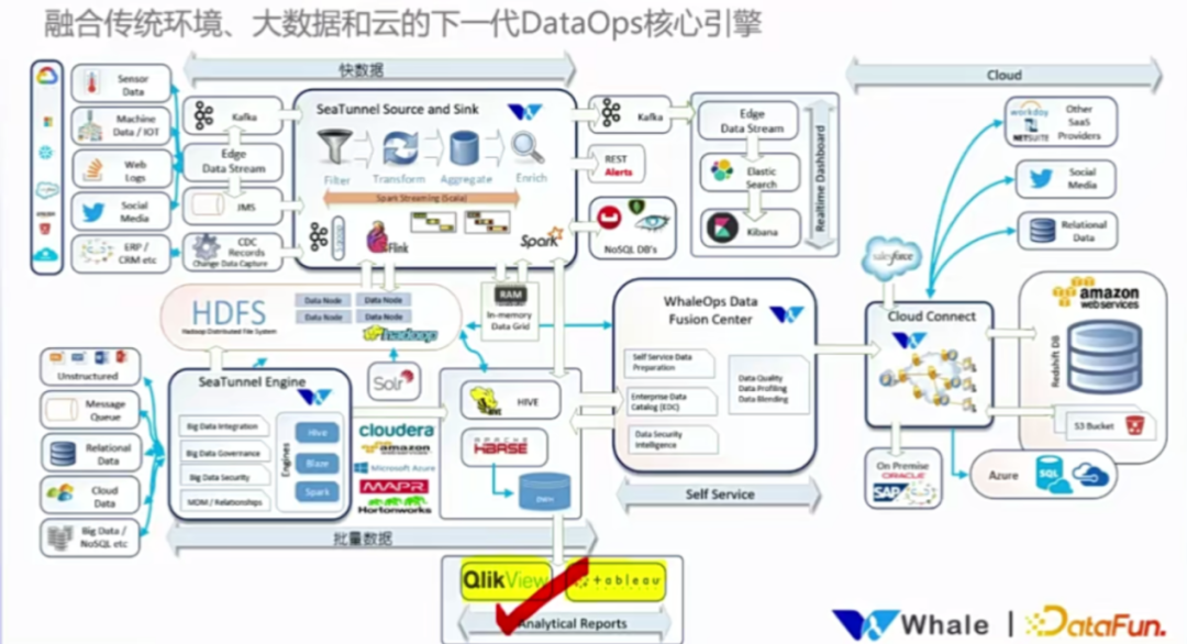 WhaleOps 产品在一个完整的数据使用场景中是如何发挥作用?首先对流式数据、快数据进行数据同步以及数据处理,然后对外提供 API 提供给实时的分析报表或展现的一些工具去使用,同时也会存副本到数据仓库和数据湖,也可以接入一些传统的数据模式。另外可以通过融合的数据中心迁移到云端对外进行服务,也可以把数据推送到一些分析报表展现的平台去使用。