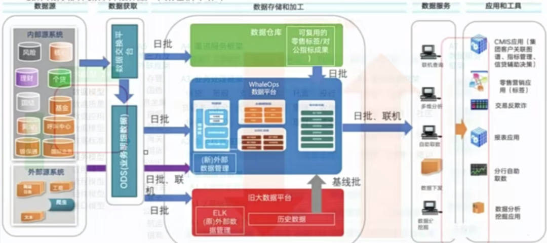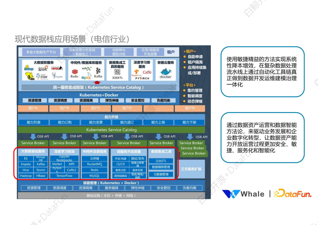 首先看一下在金融行业的运用场景,以银行为例。客户经常出现疲于应对各种紧急复杂的需求,包括数据来源异构等数据管理难点,需要来去提升整个快速响应,快速提供数据服务的能力,同时需要全链路的任务调度并完善运维机制去提升数据服务的使用效率。白鲸开源的 WhaleOps 平台配合了多样化的大数据套件来实现统一的数据开发平台,统一的分布式数据模型,统一的数据资产,同时提供包括离线数据处理,实时流数据处理的任务,并且高效地管理这些数据任务,去降低用户数据加工处理的复杂度及成本,为各种应用场景提供更好的数据服务。