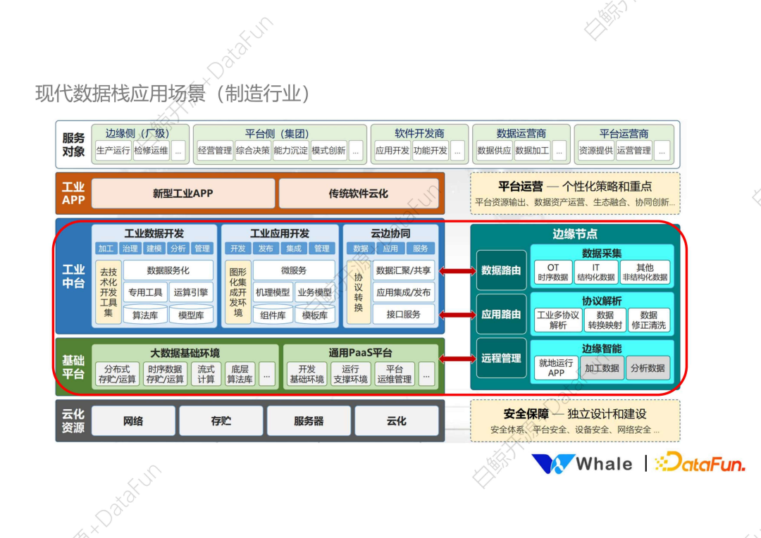 制造行业会采用很多的云边端的技术,来提升对产线的监控管理,提供物料以及提供订单的智能化精益生产的服务。因此很多客户会在整体架构中搭建一套轻量级的数据治理平台,来缩短物料的预测,物料的运输,指导流程监控,生产指导开发周期和售后服务的整体的时间。轻量级的数据治理平台里面主要会包含两个部分:第一部分是轻量化的数据湖平台,主要是针对工业场景来进行数据的采集存储以及在边端云端进行轻量化的处理,它会涵盖所有的批处理和流处理的应用场景,并且需要有多维度数据建模的能力,来去实现工业数据的融合,并且将所有计算完的数据提供给后台的大数据中心和第三方的一些应用,通过数据服务 API 给到第三方应用进行运用。第二部分是要建立一个可视化的数据开发平台以提供数据开发,数据管理,数据质量等数据服务能力。很多客户会采用白鲸开源的 WhaleOps 产品建设边端轻量化数据湖和后端数据可视化开发平台。
