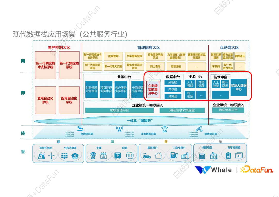 公共服务行业的应用场景,上图是客户要建立的一个新型电力系统的数据技术支撑体系,整个支撑体系分为三区四层, 三区包括生产控制大区,管理信息大区,互联网大区,另外包含采、传、存、用这四层。所以在支撑体系中需要明确控制系统和信息系统的边界,同时优化数据采、传、存、用四个环节。这种新型的电力系统各个环节的感知能力和连接能力,实现感知设备的共建共享,同时打造企业级的实时的测量中心,在线汇聚全链路采集的数据,来推动各个业务的贯通和灵活构建,还实现设备透明化,数据透明化和应用透明化。因此在这个项目中,WhaleOps 在帮助客户实时地汇聚全环节所采集的数据,以方便电网资源的维护,同时通过数字系统的实时计算推演和分析,来实现电网在数字空间的实时动态呈现,以建立一个能源的大数据中心,并且接入很多第三方的外部数据来统一支撑全球能源互联网的日常管理和交易等业务的开展。