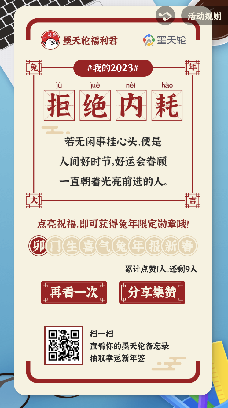 这本备忘录里除了刻录你在2022年留下的技术印记,还承载着满满的新年祝福,赶紧为2023年的自己抽取一张好运签吧~