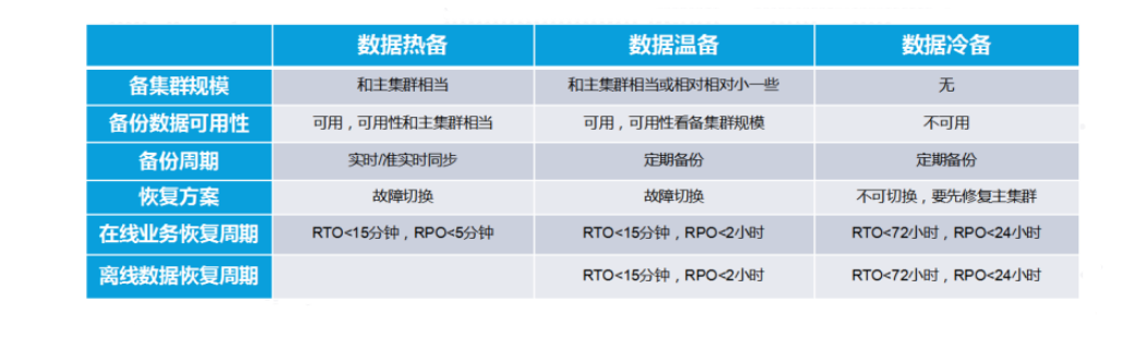 三是数据冷备,不建设备份集群,以低成本方式将数据以文件形式备份到文件系统、文件服务器等,集群故障后,修复或新建集群,在规定的RTO时间恢复数据和业务。