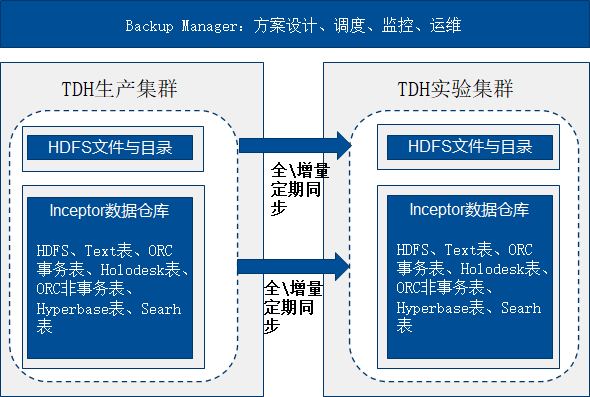 -高本低效,有限的灾备作用下,将Inceptor、Hyperbase、Search、ArgoDB等表数据先复制一份到HDFS,然后备份HDFS文件,代价极高,效率低,同时占用大量对主集群计算资源,造成性能下降甚至影响稳定性。