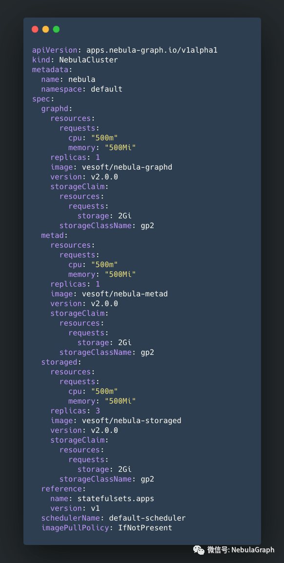 下面结合部署 nebula 集群的 CR 文件,来了解下 Nebula Operator 的核心功能。
