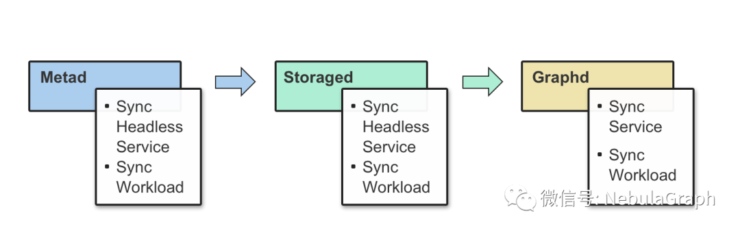 spec 里需要重点关注三个描述部分:graphd、metad、storaged,他们分别表示 Graph 服务、Meta 服务、Storage 服务,控制器会在协调循环里依次检查内置的 API 对象 StatefulSet、Service、ConfigMap 是否就绪,假如某个依赖的 API 对象没有创建成功或者某个 Nebula Graph 组件服务协调异常,控制器就会结束返回,等待下一次协调,并重复这个过程。