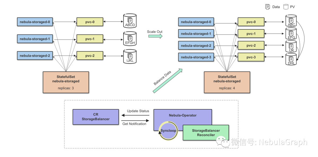 Storage 扩容分为两个阶段,第一个阶段需要等待所有新增扩容的 Pod 状态为 Ready,第二个阶段执行数据 Balance Data 操作,数据 Balance 的任务由 CRD StorageBalancer 定义,这里将控制器副本的扩容流程跟数据 Balance 流程解耦,可以实现数据 Balance 任务的定制化,比如:添加任务执行时间,在业务流量较低时执行,可有效减小数据迁移对于线上服务的影响,这也符合 Nebula Graph 本身的设计理念:没有采用完全自动化 Balance 方式,Balance 时机由用户自己控制。
