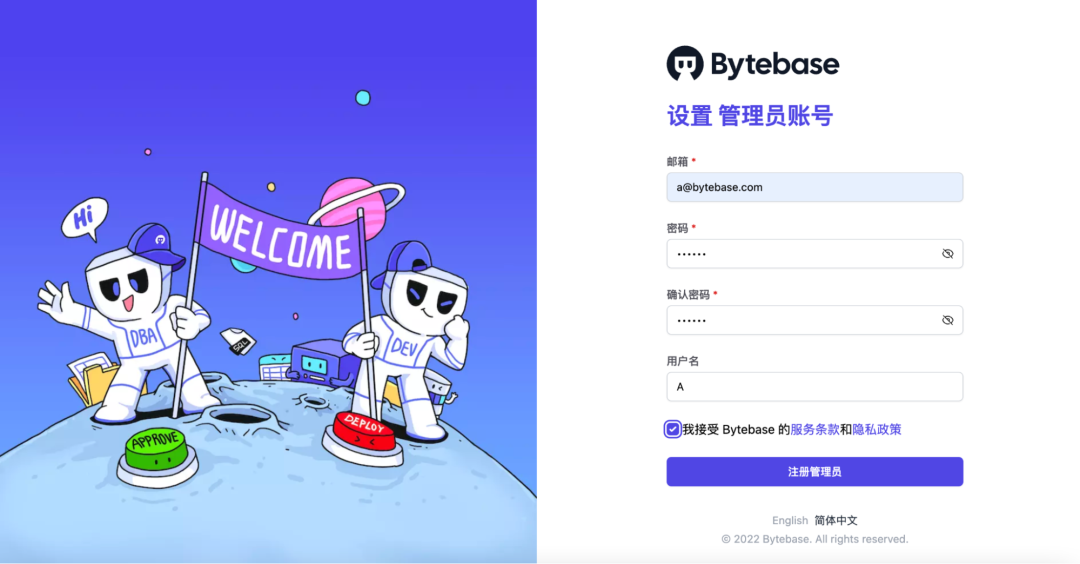 注册管理员账号 A,后面使用 DBA 指代该账号。该账号将会被赋予 工作空间所有者