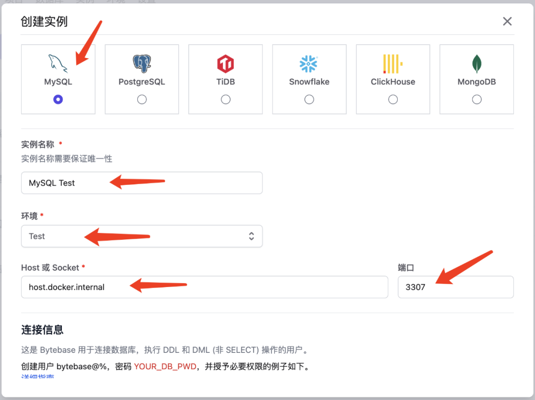 根据提示或点击添加实例,在实例里添加针对于 Test 环境的实例,配置如下图,用户名/密码为 root/testpwd1