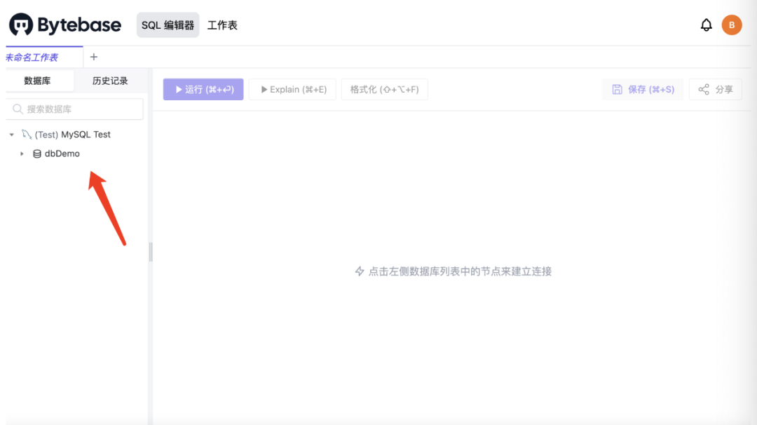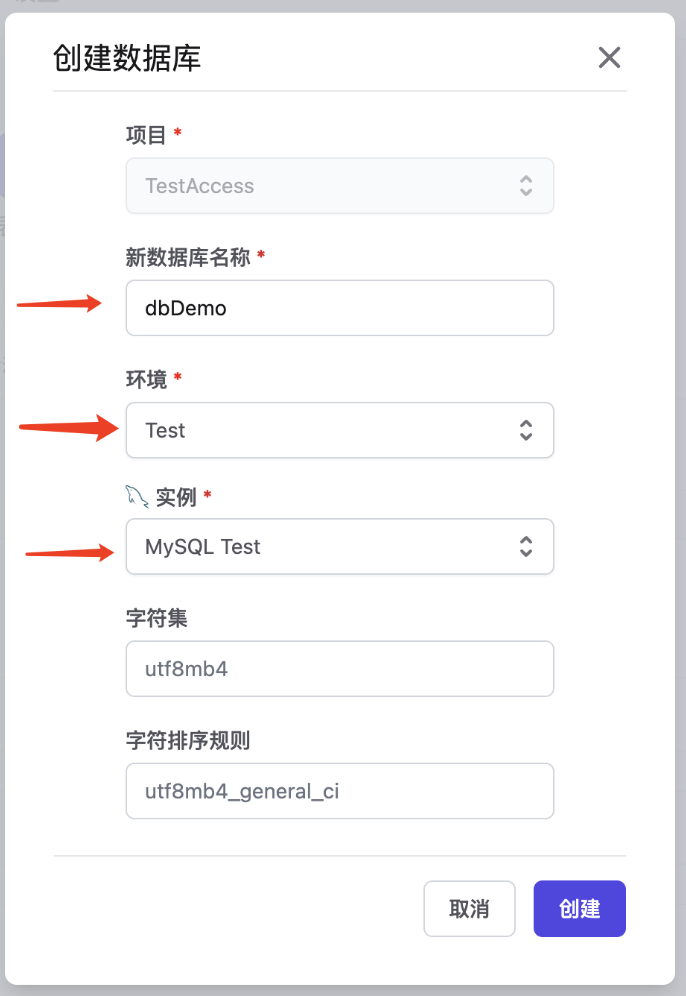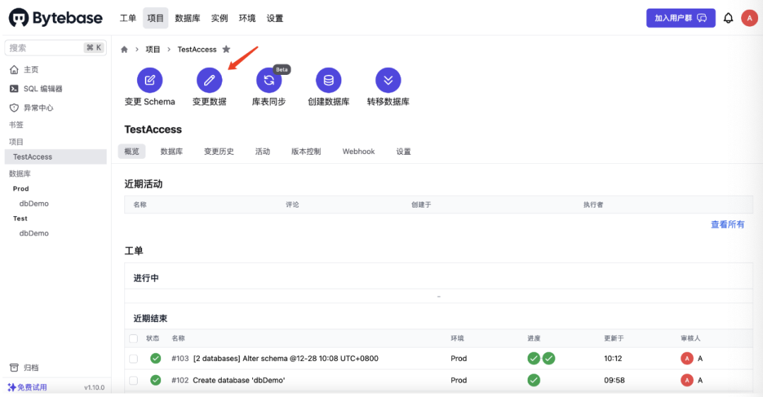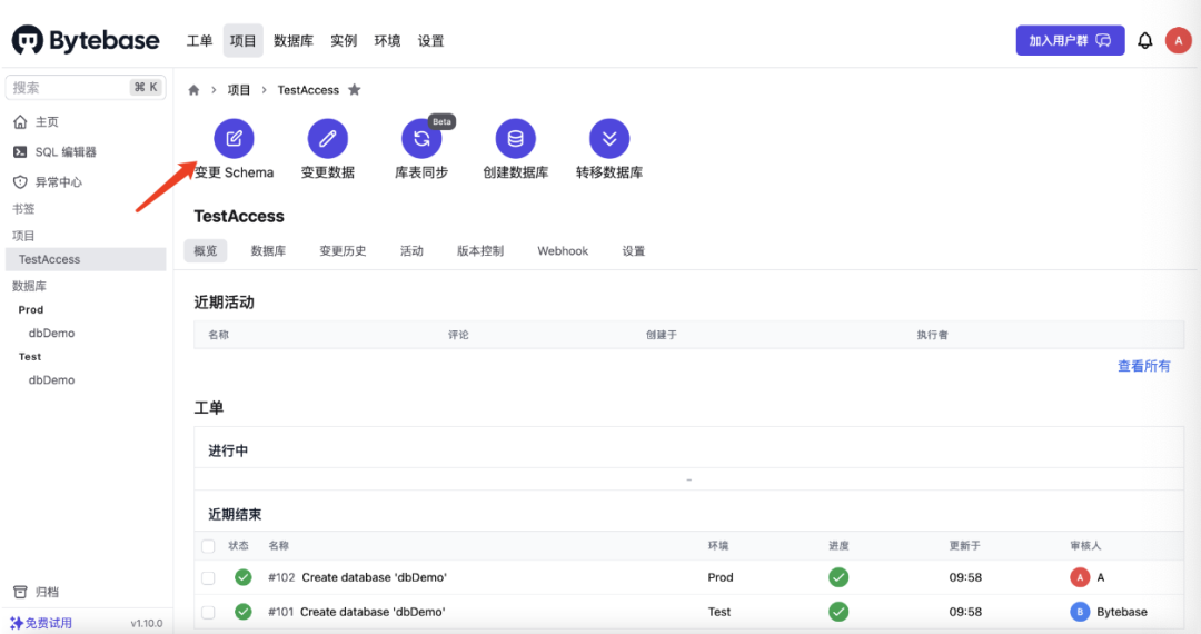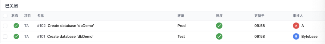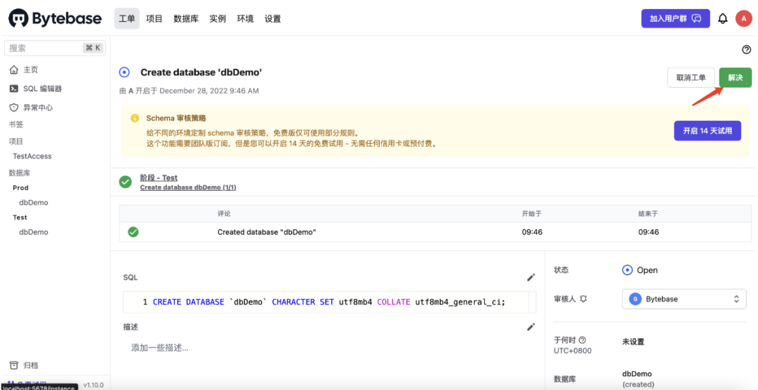 根据提示或进入该项目点击创建数据库,建立数据库 dbDemo。该操作会生成一个自动执行的工单,因为是在 Test 环境上,默认配置为无需手动审核。点击解决。