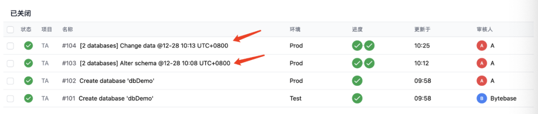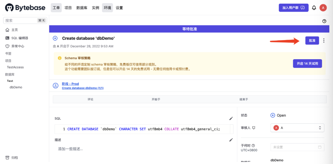 重复「3」,在 Prod 实例上添加数据库 dbDemo,需要注意的是,因为位于 Prod 环境上,根据默认配置,该工单需要手动批准。点击批准。点击解决。