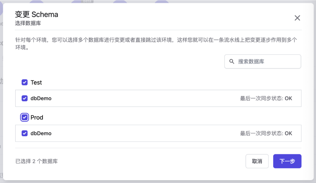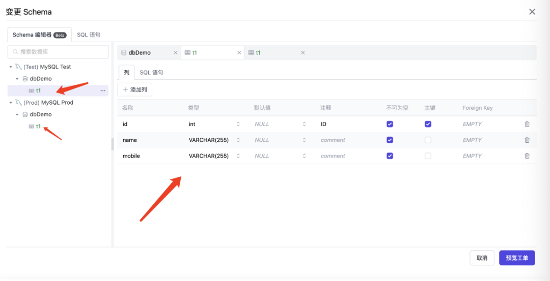 通过 Schema 编辑器,为 Test 和 Prod 的实例添加表 t1。