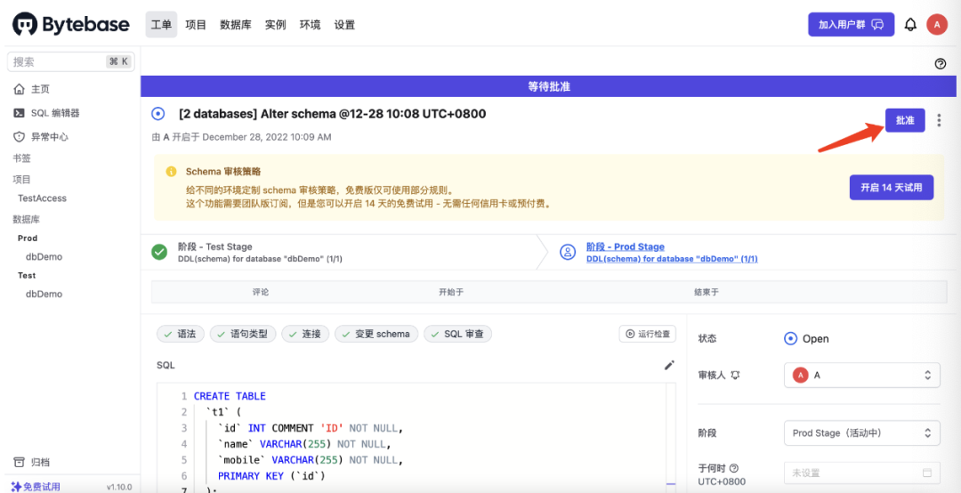 点击预览工单后,会形成同时包括变更 Test 和 Prod 环境的流水线,Test 阶段会自动执行,Prod 阶段需要手动批准。点击批准。点击解决。
