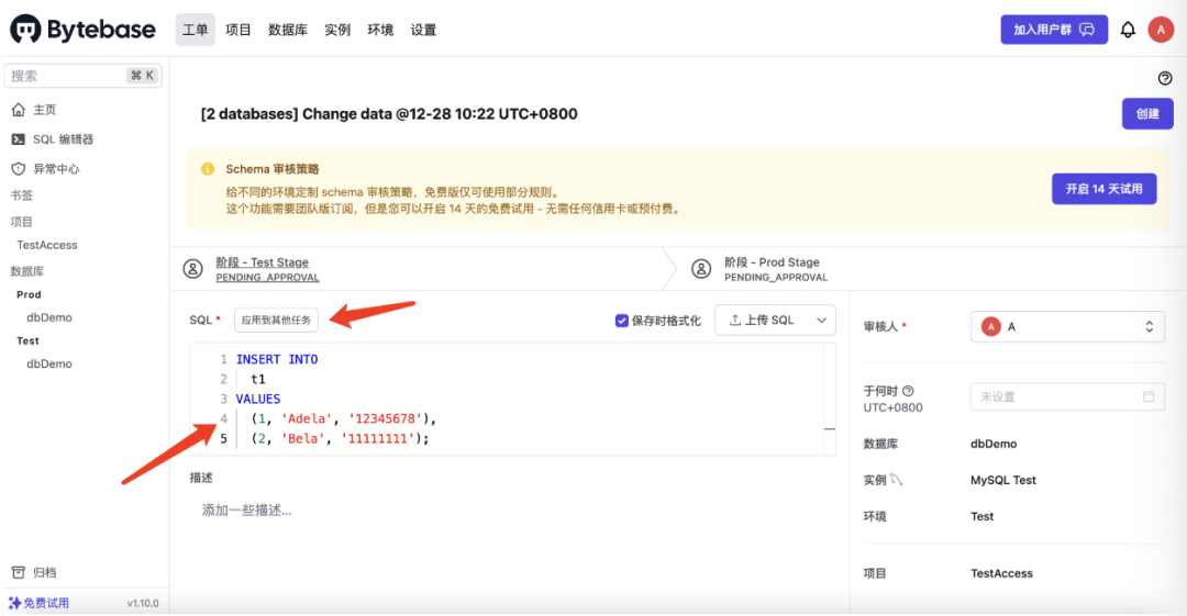 再次选择 Test 和 Prod 两个环境,进入到新建工单页面,填充 SQL,点击应用到其它任务。点击创建。