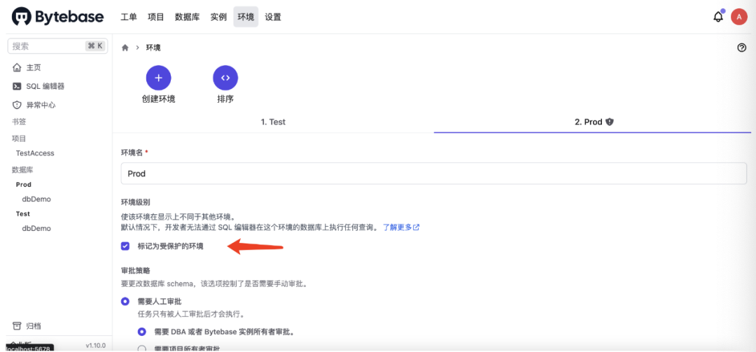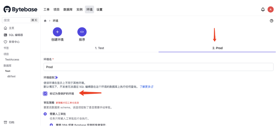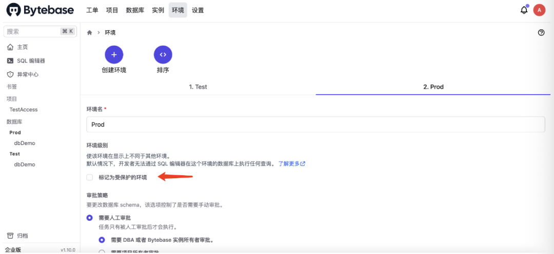 通过 DBA 账号登录,点击顶部栏的环境。点击 Prod,选择标记为受保护的环境,下滑,点击更新。如果再次回到该页面,可以看到 Prod 环境旁的小盾牌。意味着该环境收到了保护。