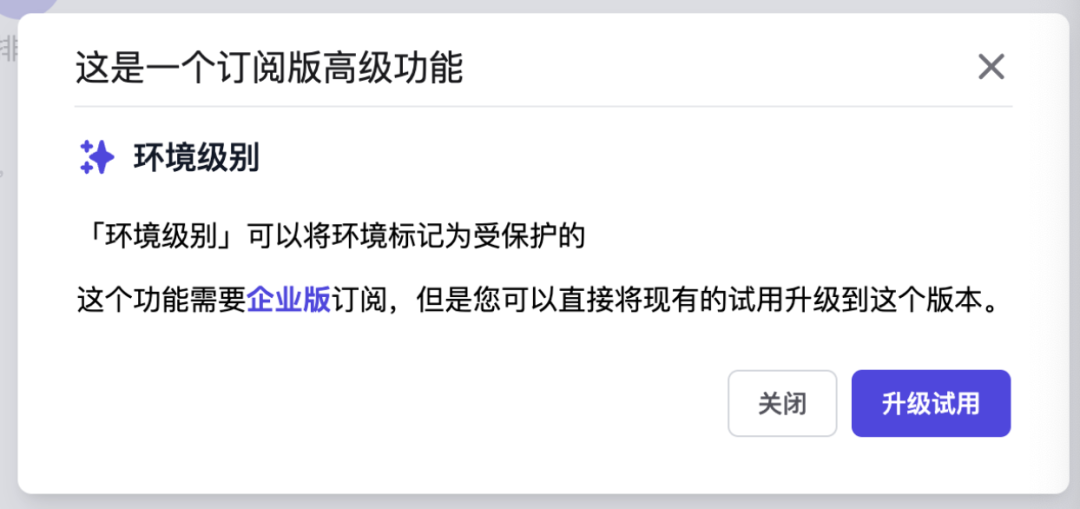 此时会询问是否升级为企业版,点击升级试用。即可升级为企业版,此时 Prod 环境标题旁多了一个小盾牌,代表受保护的环境。
