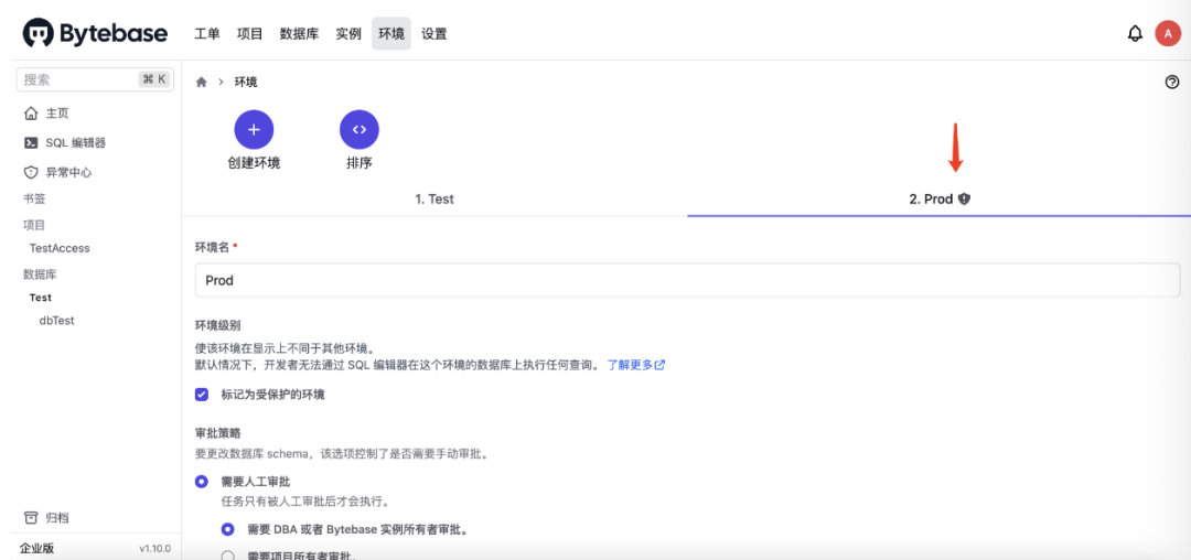 此时开启的为团队版试用,为了再升级至企业版,点击顶部栏的环境。点击 Prod,勾选标记为受保护的环境,下滑,点击更新。