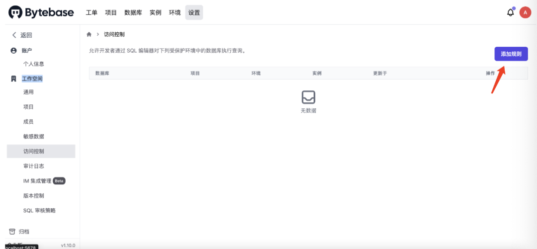通过 DBA 账户登录,点击顶部设置 ,点击工作空间 > 访问控制。点击添加规则。