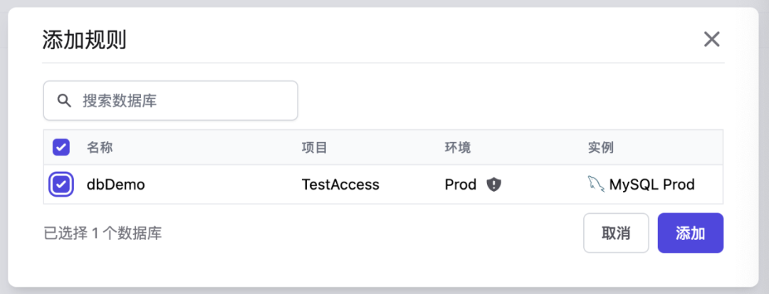 选择 Prod 环境对应的数据库,点击添加。这种情况下,DBA 将 Prod 环境设为保护,但开启了白名单,添加规则的数据库仍可见。