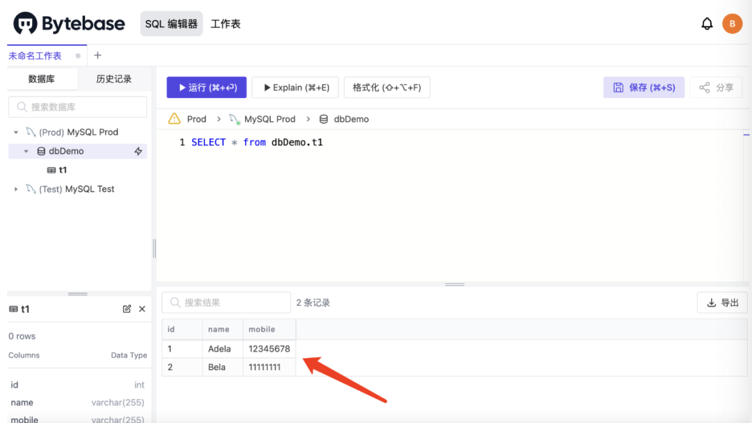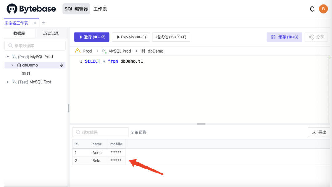 通过开发者账号,在 SQL 编辑器里查询 Prod 环境下的数据。在这里,我们希望对 mobile 这个字段进行脱敏处理。