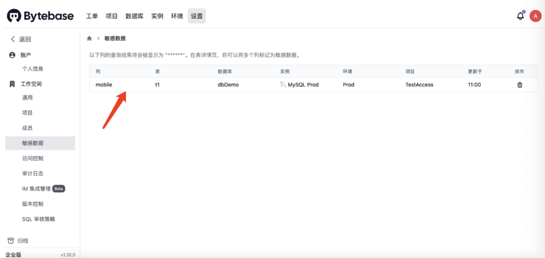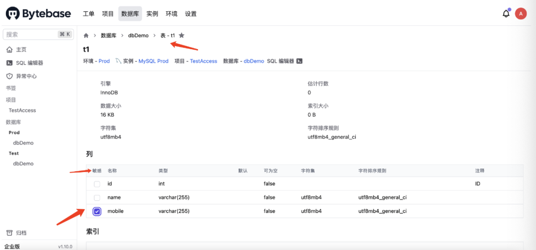 通过 DBA 账户登陆,通过找到 Prod 环境下的 dbDemo,进入 t1 表内。勾选 mobile 这列。之后也可以通过设置 > 敏感数据,对各规则进行管理。