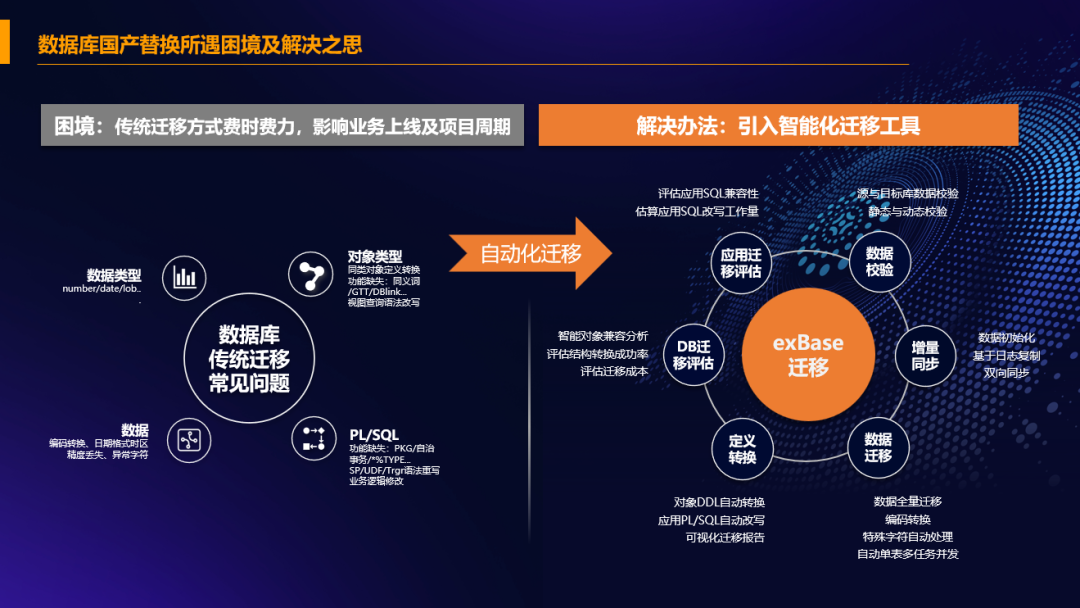 央国企在国产数据库替代过程中,往往面临三重困境,海量数据凭借技术自主创新和企业级内核能力、一键式异构数据库迁移平台exBase,为央国企的国产数据库部署提供了完善解决方案,很好地解决了用户痛点。